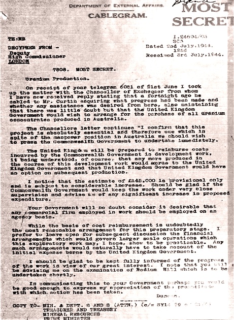 As we saw earlier, in 1944, the British government approached PM Curtin to brief him on the atomic bomb effort and the pressing need for Australian uranium for ‘Empire and war purposes. On 2 July 1944, had issued a cable from the British Chancellor of Exchequer to PM Curtin, stating: