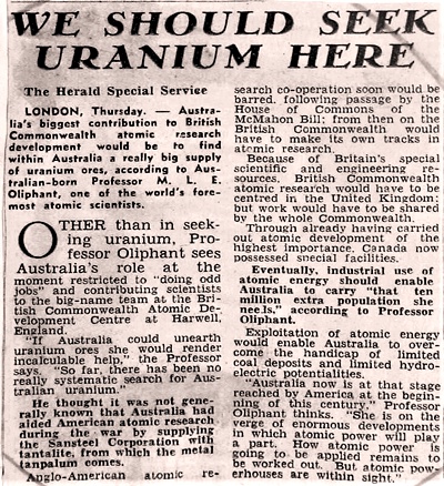 In a Special Services Report, Professor Oliphant wanted Australia to ‘systematically search for Australian uranium’. He believed that atomic energy would eventually enable Australia to carry ten million extra people and overcome the handicaps of limited coal deposits and limited hydro-electric potentialities. His comments were taken up by the Commonwealth government. Oliphant was a keen supporter of both the development of Uranium and atomic power, including weapons.