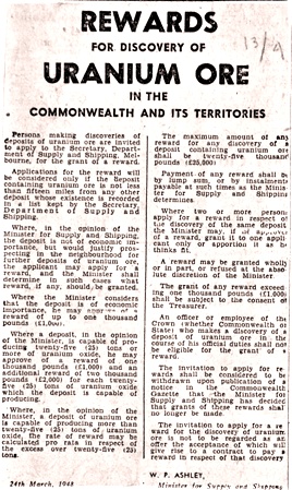 Minister of Supply and Shipping W P Ashley, sent out a memorandum declaring financial incentives for new discoveries of uranium ore across Australia and its territories. This included a reward of £1000 for any find capable of producing 25 tons or more of uranium ore, and an additional reward of £2000 for each 25 tons of uranium oxide which the deposit would be capable of producing.